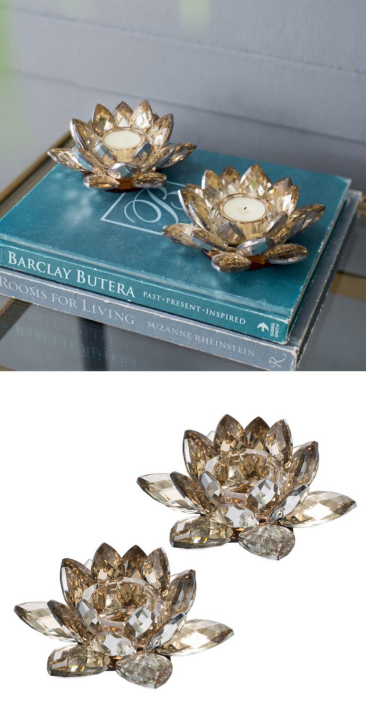 透明感あふれる美しい輝きが魅力の、ロータス(蓮)モチーフのクリスタルキャンドルホルダー2個セット。