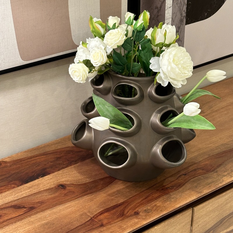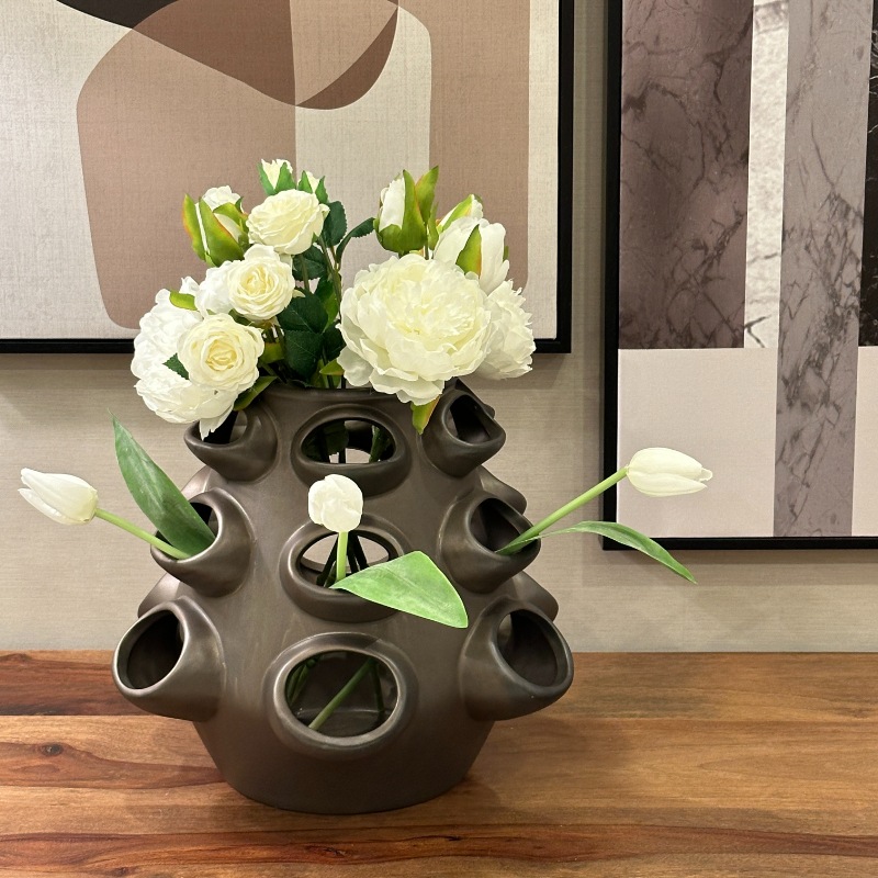 このまま飾るのも良し、18の穴と上の大きめの口に花やグリーンをアレンジしてみては。
