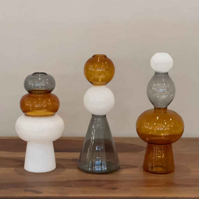 スタイリッシュなフォルムと個性的なカラーコンビネーションが目を引くガラスフラワーベース。クリアグレーの円錐形ベースに、ホワイトとアンバーの丸いガラスパーツを重ねたデザインは、まるでアートピースのような存在感を放ちます。