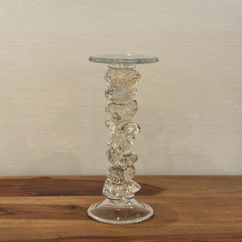 本体は透明度の高いガラスで成形され、中心部には立体的な泡状ガラスとゴールドのラメが流れるようにデザインされています。光を受けるたびに内部の輝きが反射し、キャンドルを灯さなくても視覚的な美しさを楽しめるのが魅力です。