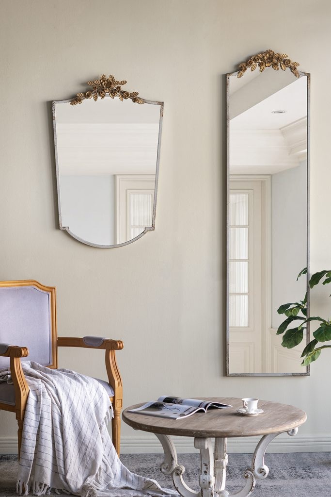 玄関やリビング、寝室の壁面を上品に演出し、姿見としてはもちろん、ウォールデコレーションとしても活躍します。ミラーの上部にあしらわれた繊細な花飾りが、空間にクラシックなエレガンスをもたらしてくれる一枚です。