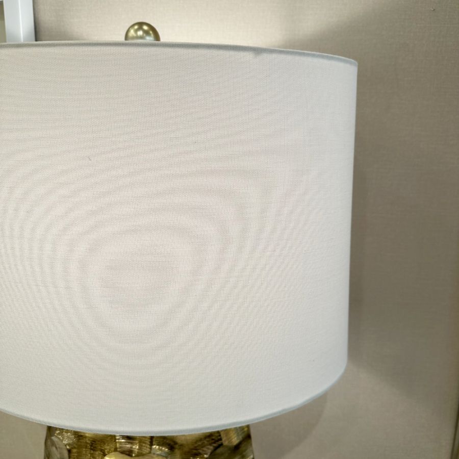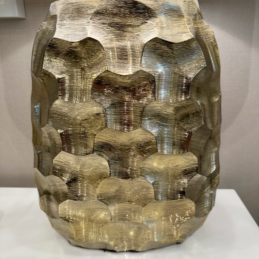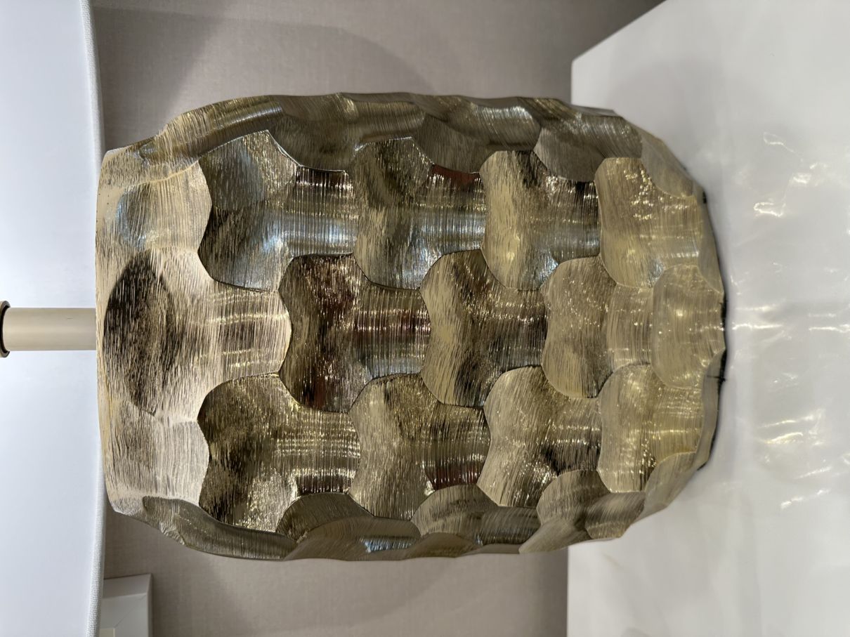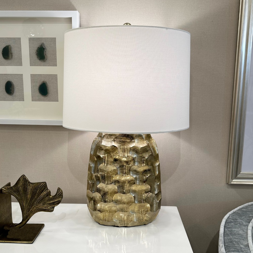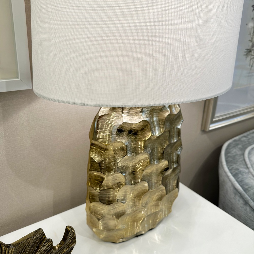 立体的なハニカムパターンが目を引く、重厚感あふれるゴールドのメタルベースが特徴のテーブルランプ。