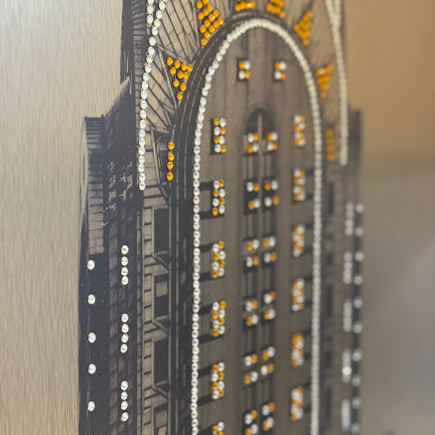 クライスラー・ビルの美しいシルエットを描いたモノクロデザインに、煌めくクリスタル風ストーンを贅沢にあしらい、まるでビルの窓が光を放つかのような立体感と輝きを演出します。