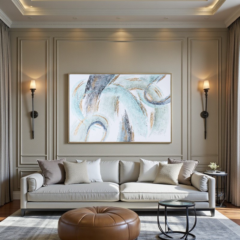淡いアクアブルーにゴールドやチャコールのアクセントが空間に洗練された印象を与えます。