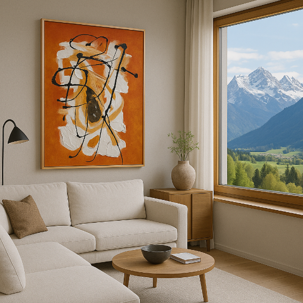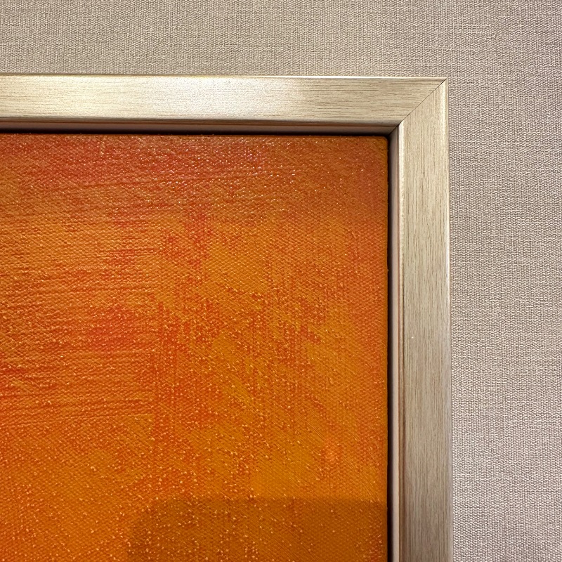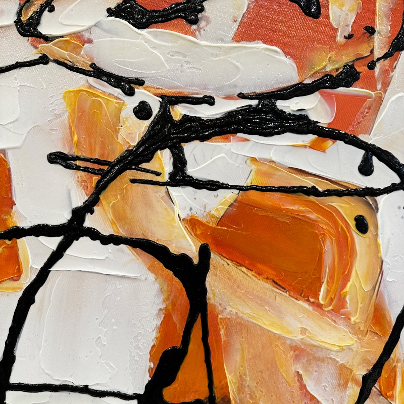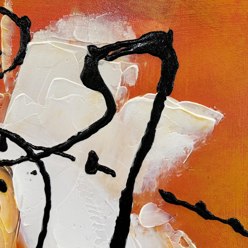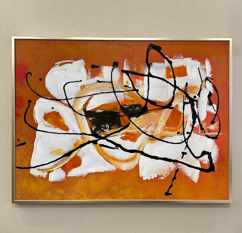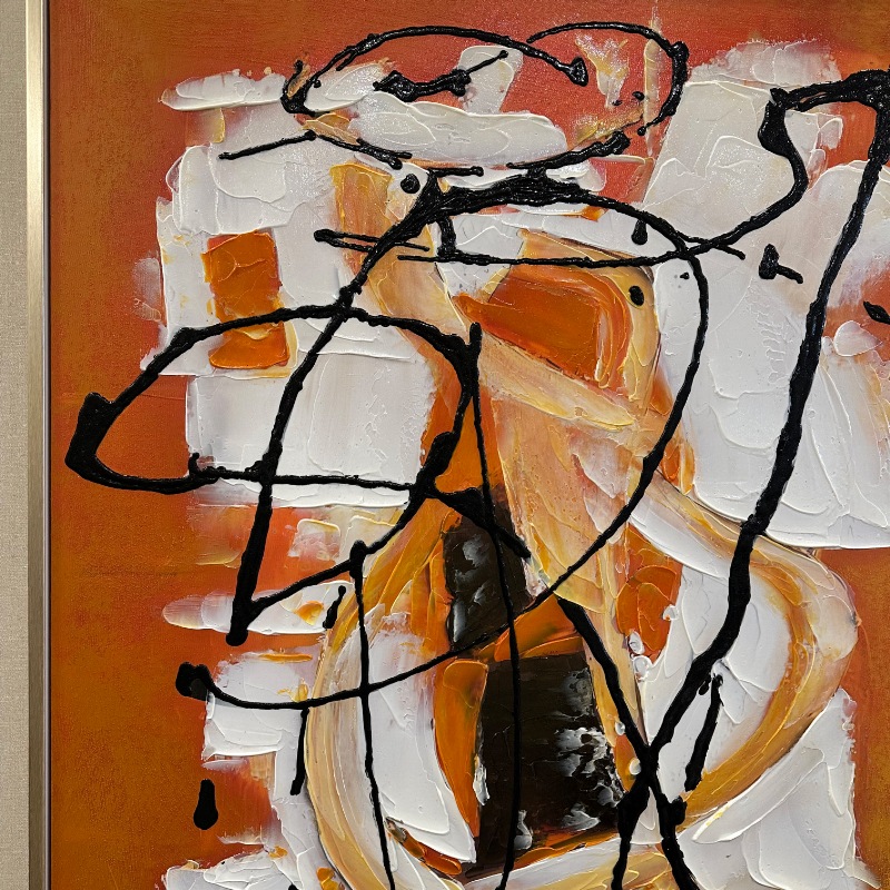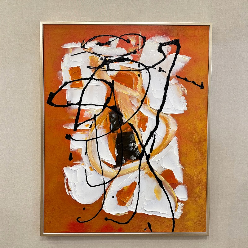 厚みのある筆致で大胆に重ねられた白とオレンジの絵の具が、立体感と動きを感じさせます。さらに力強い黒のラインが全体を引き締め、リズム感のある印象を演出。