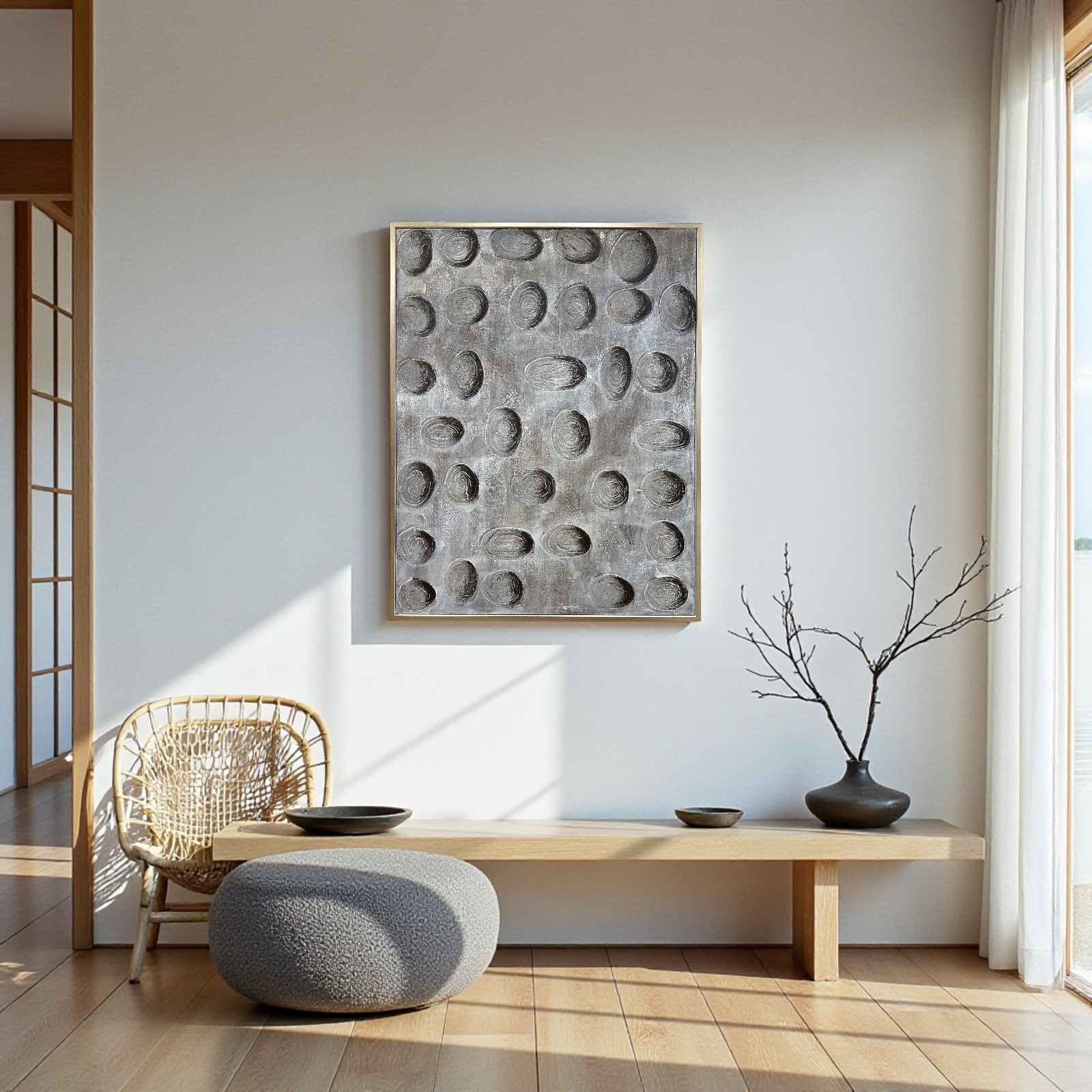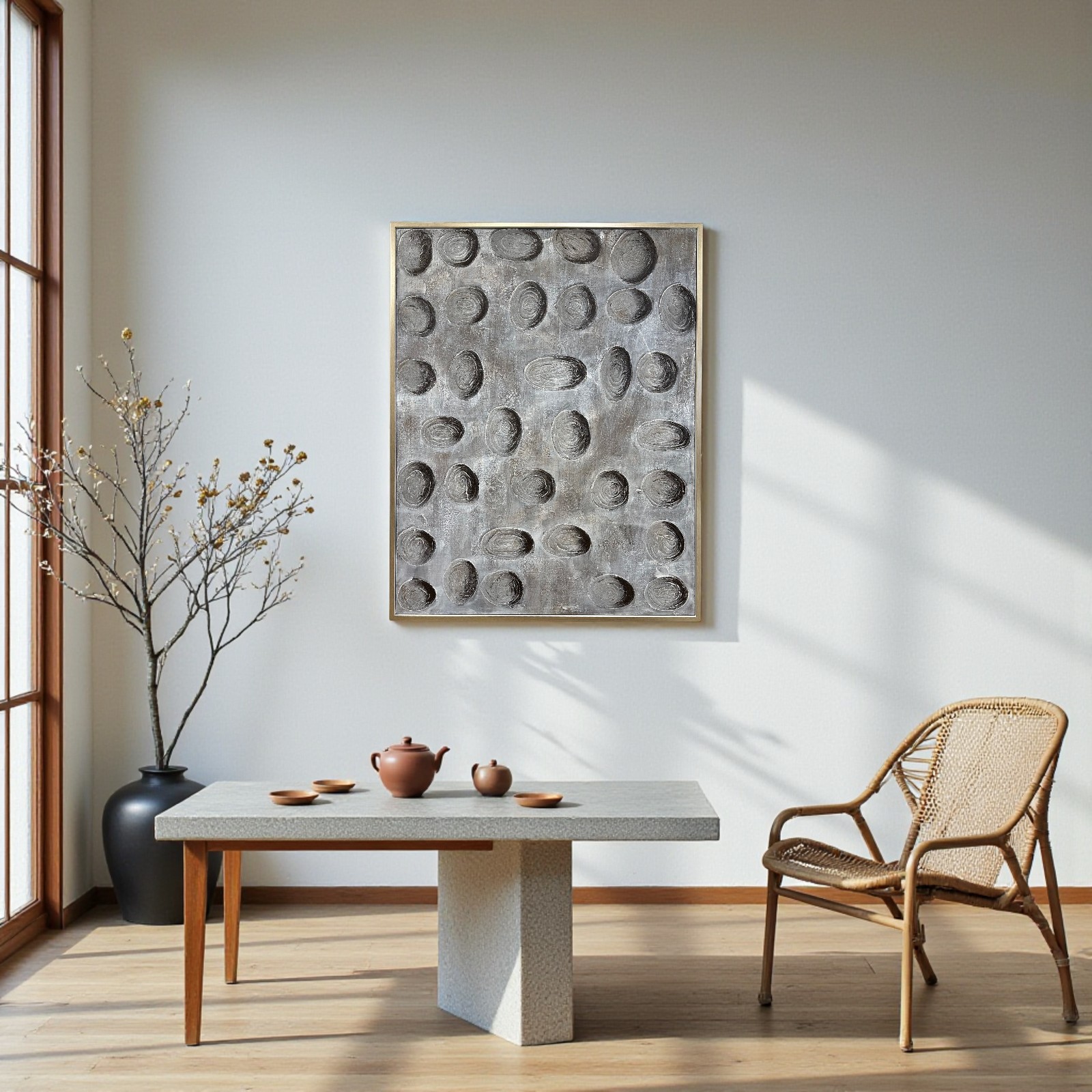 グレートーンを基調にした落ち着きのある色合いに、立体的な渦模様が規則的に並び、奥行きを感じさせます。