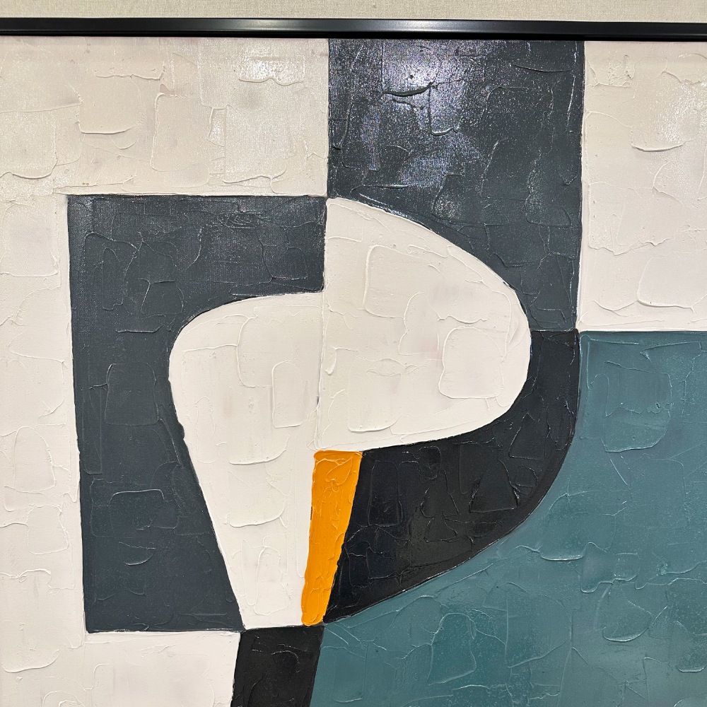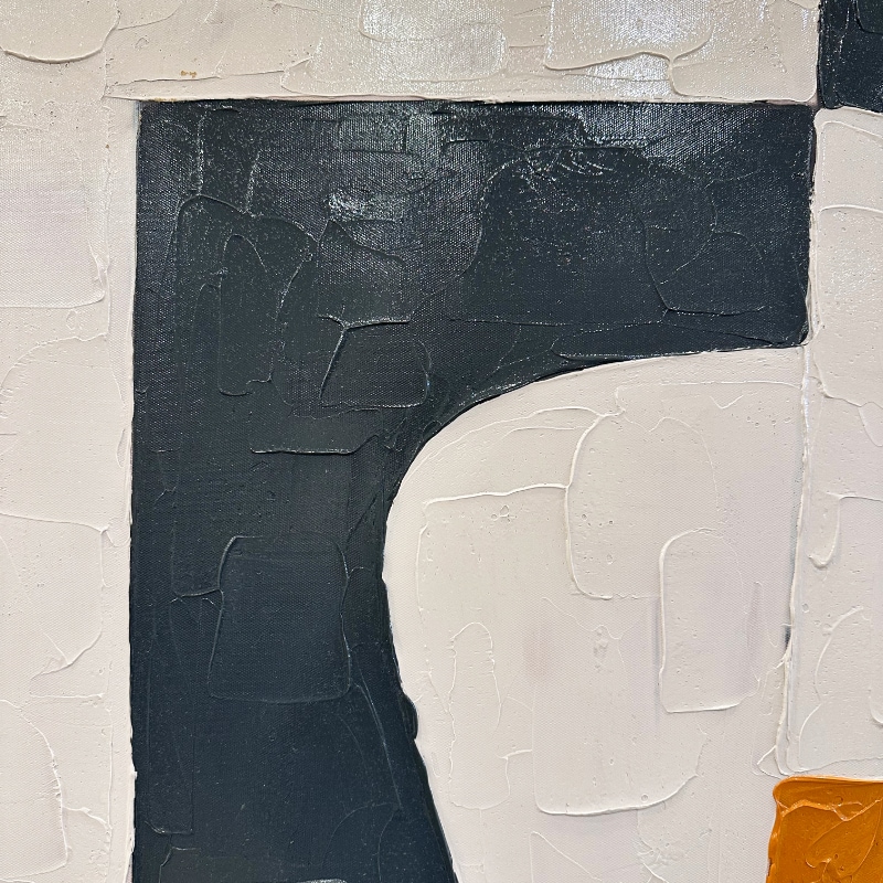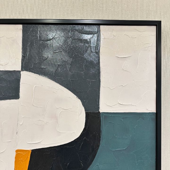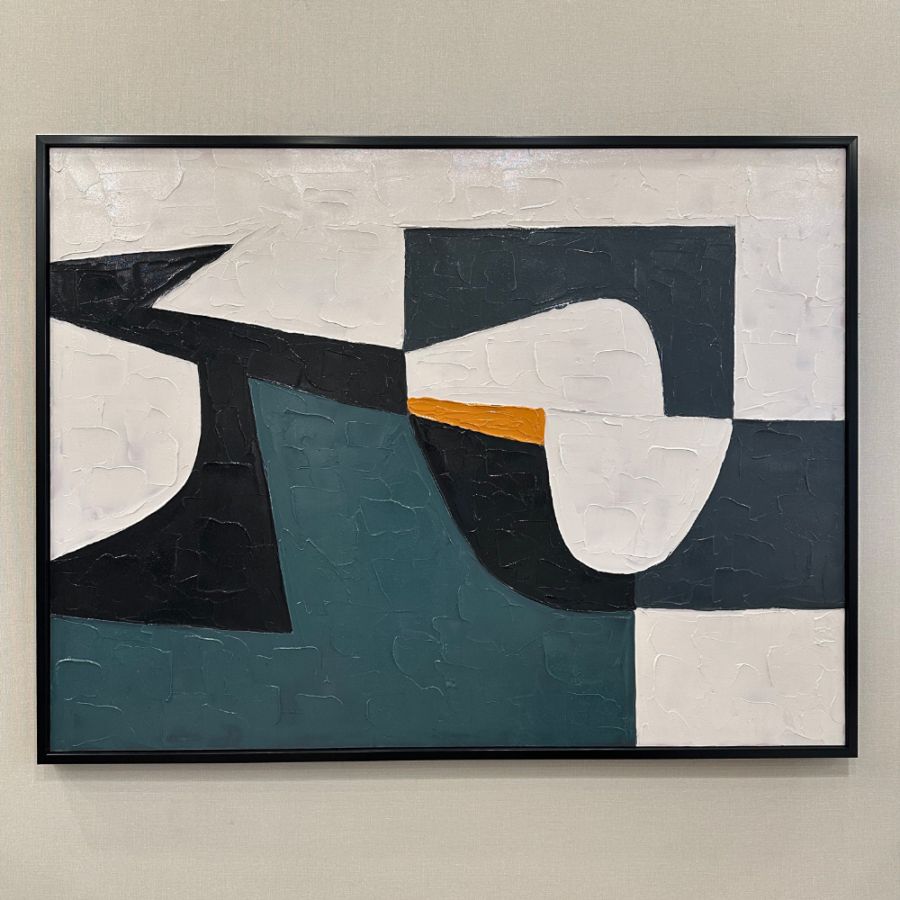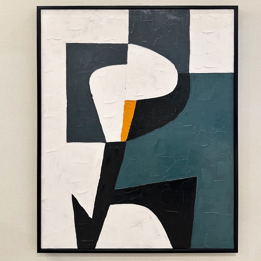 凹凸のある力強い筆致が生み出す立体感と、ホワイト・ブラック・ダークグリーンに差し色のオレンジを組み合わせたモダンな色合いが魅力で、空間に個性的なアクセントを加えます。