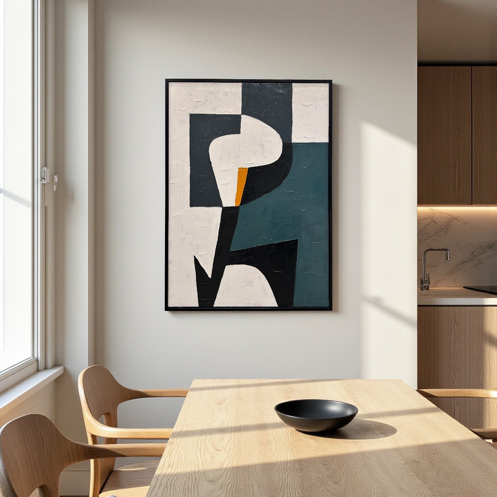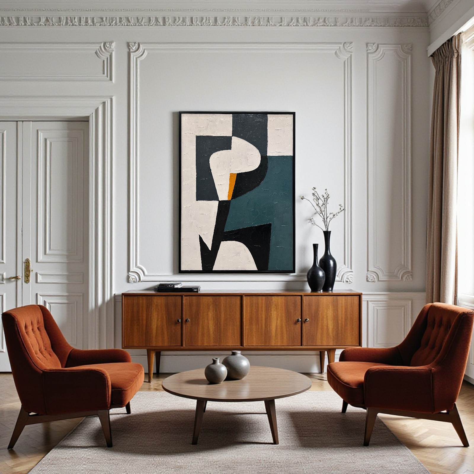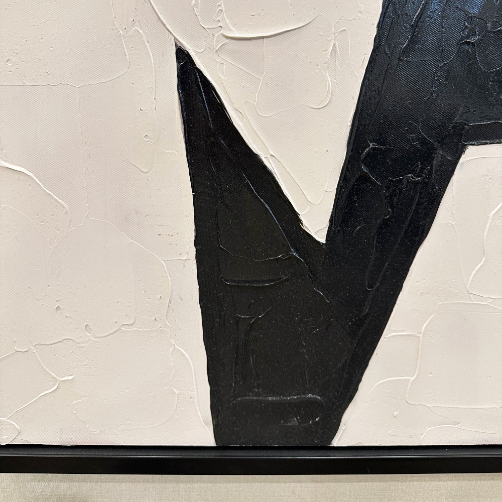 凹凸のある力強い筆致が生み出す立体感と、ホワイト・ブラック・ダークグリーンに差し色のオレンジを組み合わせたモダンな色合いが魅力で、空間に個性的なアクセントを加えます。
