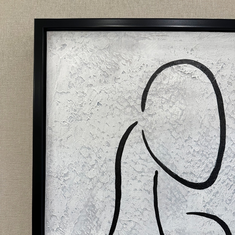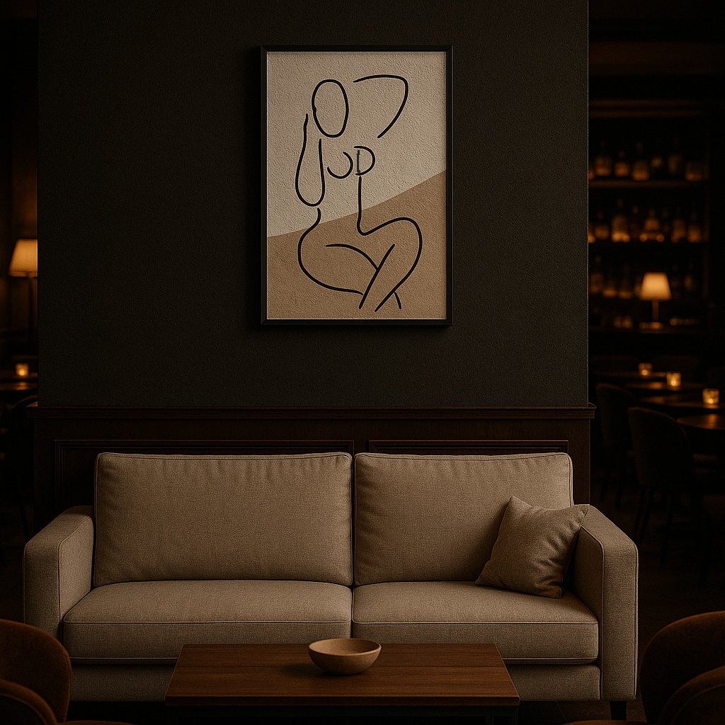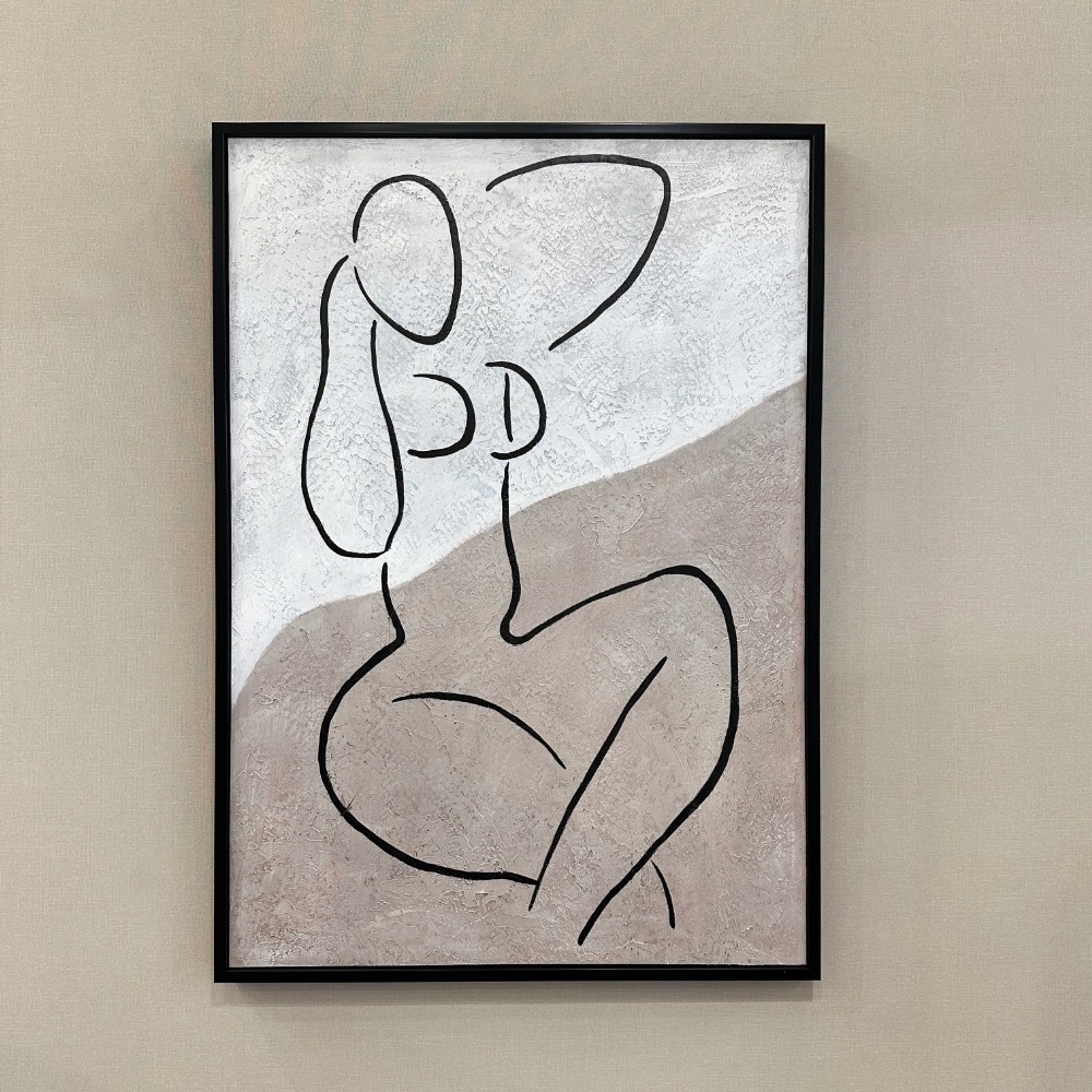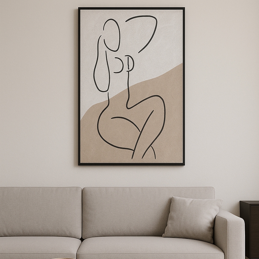 落ち着いたベージュとホワイトの背景に描かれたシンプルな女性シルエットが、洗練されたおとなの空間を演出。余白を生かしたモダンなデザインは、リビングや寝室をスタイリッシュで上質な雰囲気に仕上げます。