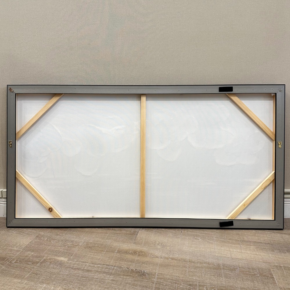 ブラウンとゴールドをベースに立体感のあるホワイトフラワーを描き、上品で高級感のある空間を演出します。ソファ上やダイニング、玄関など横長のスペースに最適です。