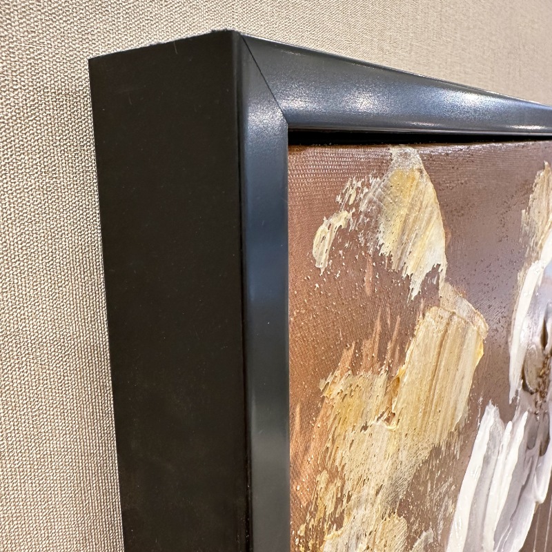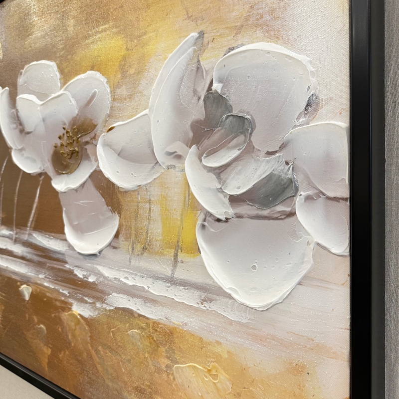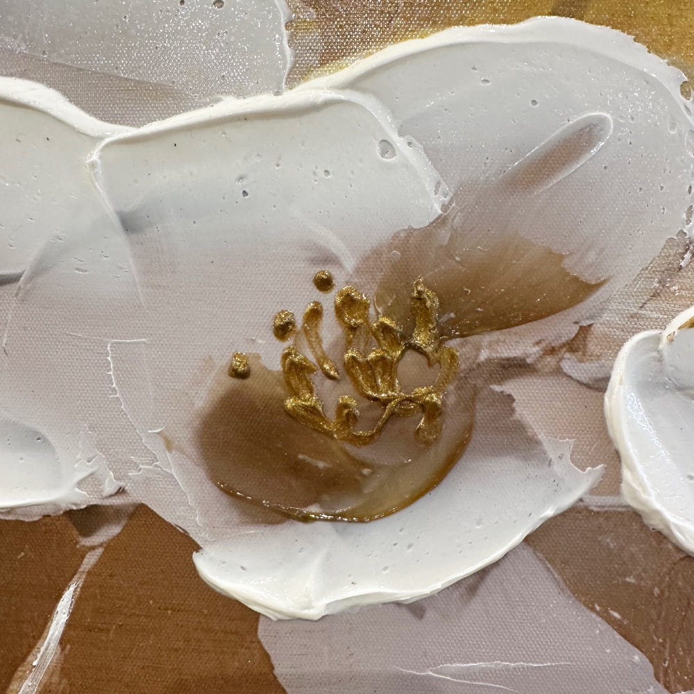 厚みのあるホワイトの花びらが立体的に浮かび上がるように描かれ、筆跡の力強さが際立ちます。背景のブラウンにゴールドを混ぜ合わせることで奥行きが生まれ、空間を華やかに引き立てます。