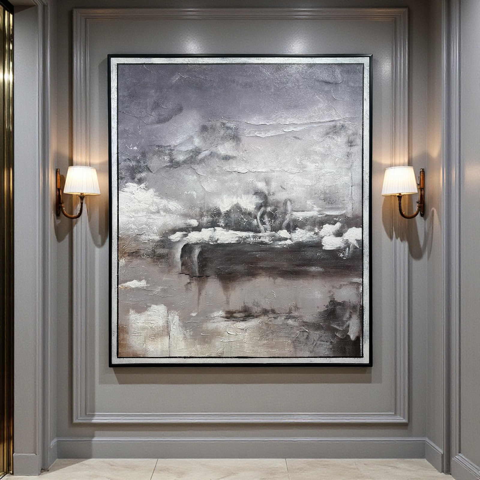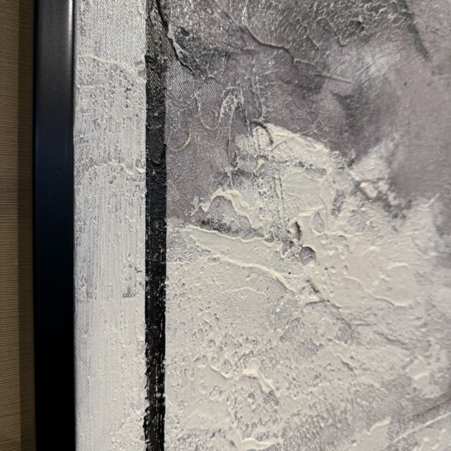 153×183cmの大きなサイズで迫力がありながら、落ち着いたモノトーンの色合いで空間に自然と馴染みます。