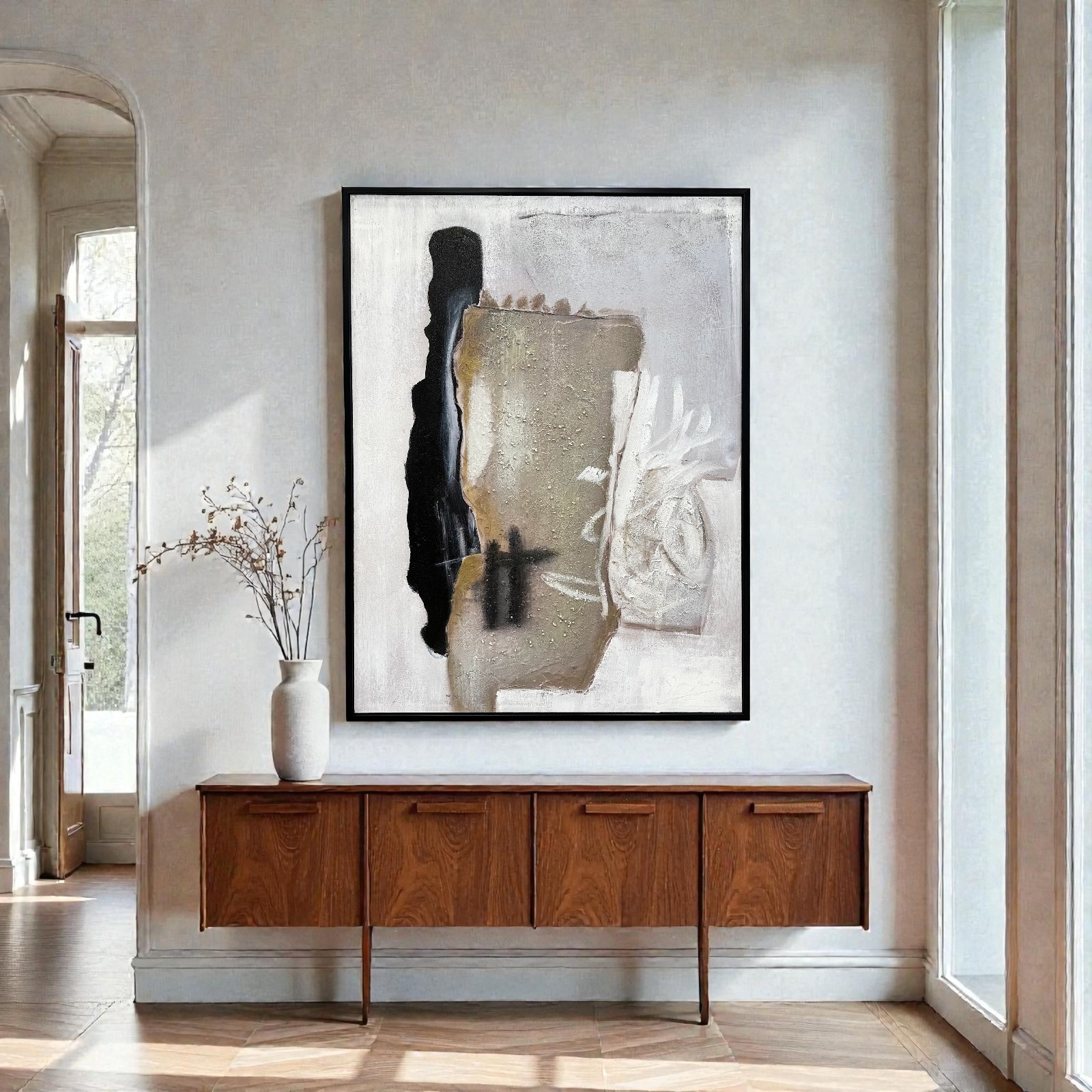 モダンな空間を彩る抽象デザインの大型インテリアパネル。存在感あるサイズで、リビングや寝室、オフィスやホテルロビーなど幅広いシーンにマッチします。