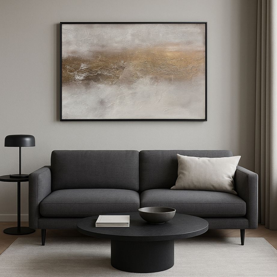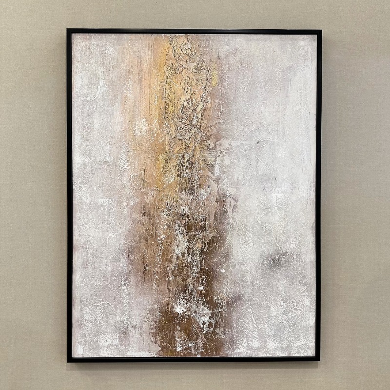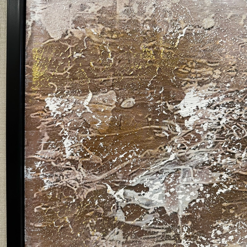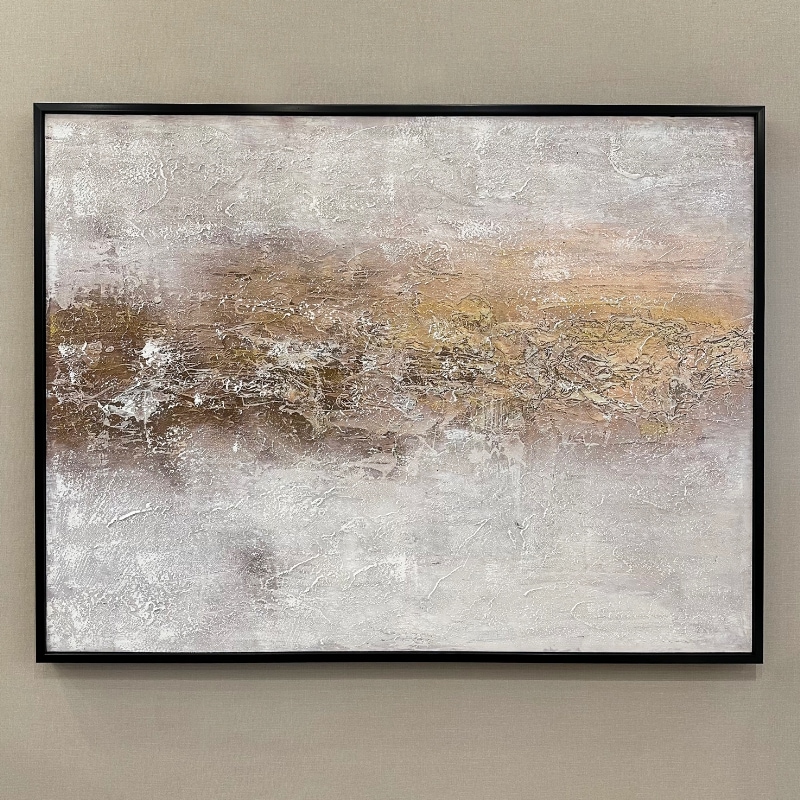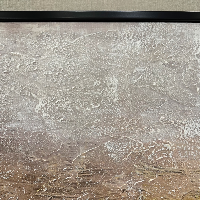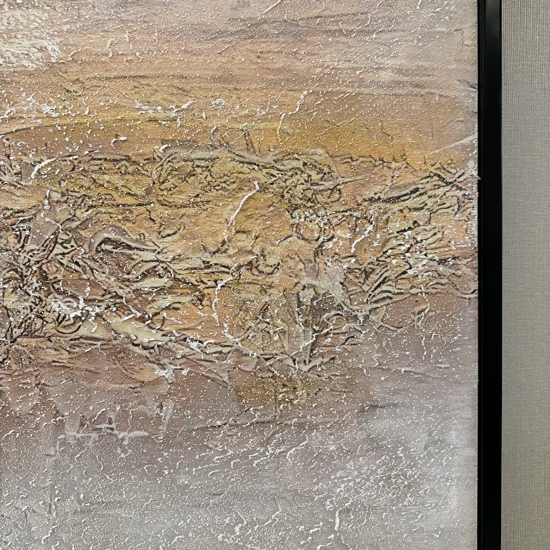 重ね塗りによる凹凸感のある筆致と、繊細に散りばめられたホワイトやゴールドのタッチが特徴。立体感と奥行きを感じさせ、空間に豊かな表情を与えます。
