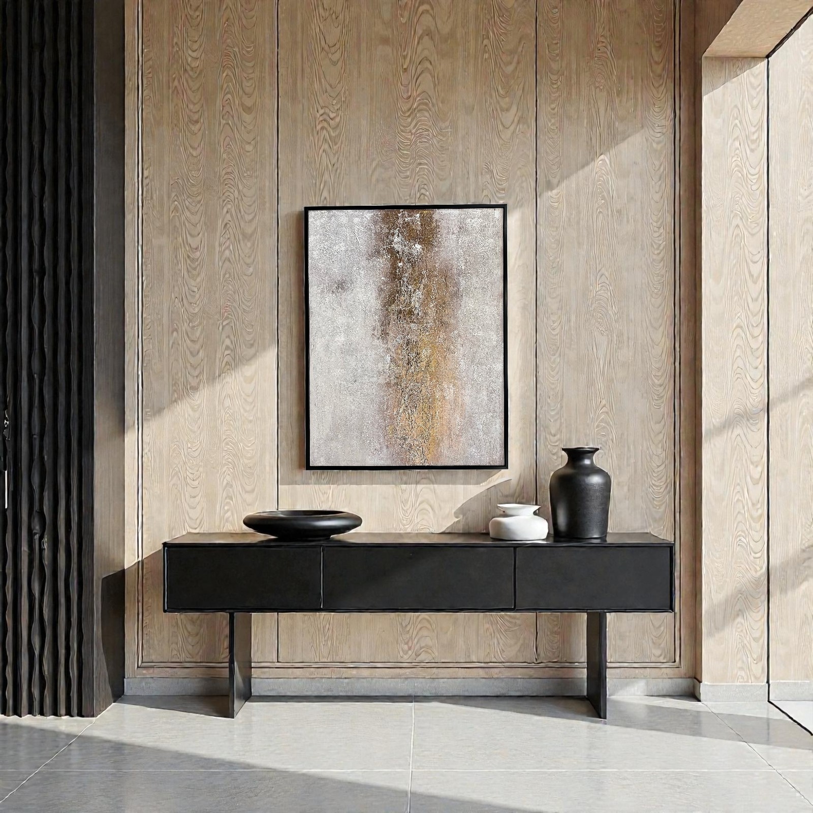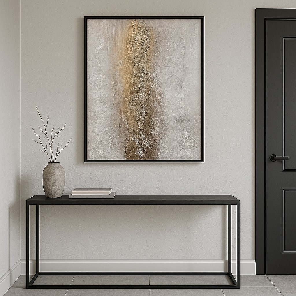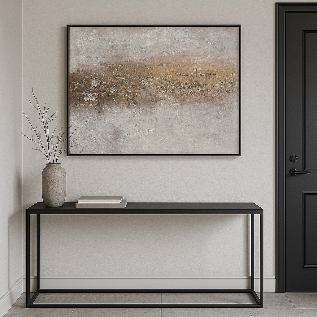 重ね塗りによる凹凸感のある筆致と、繊細に散りばめられたホワイトやゴールドのタッチが特徴。立体感と奥行きを感じさせ、空間に豊かな表情を与えます。