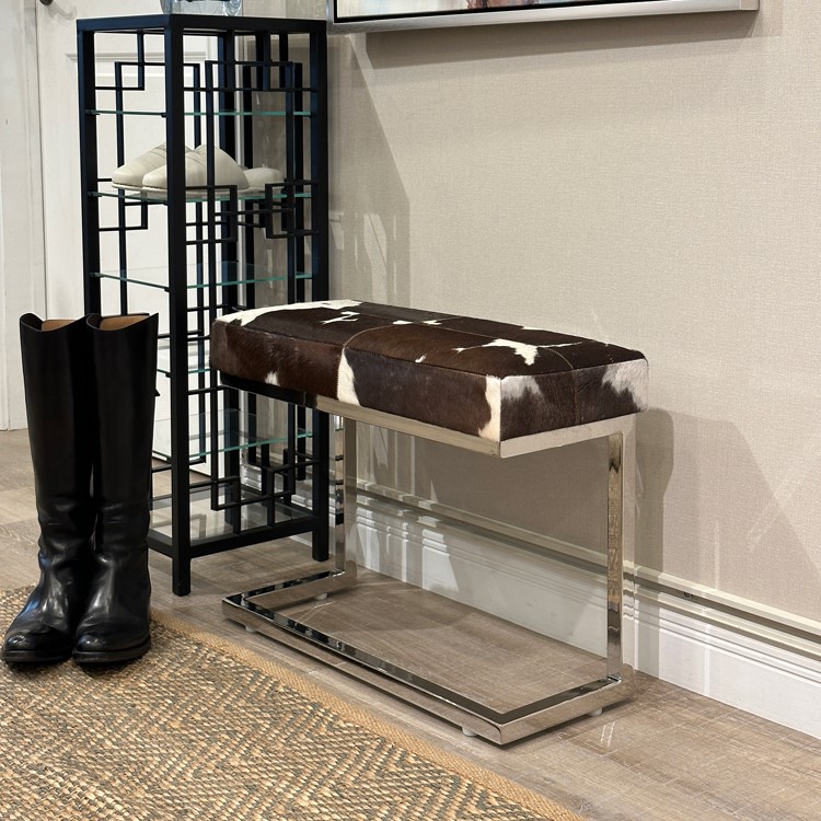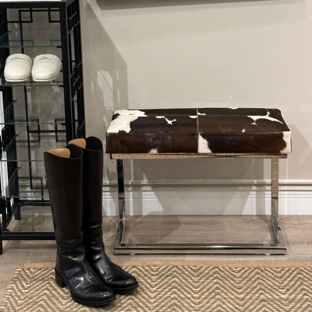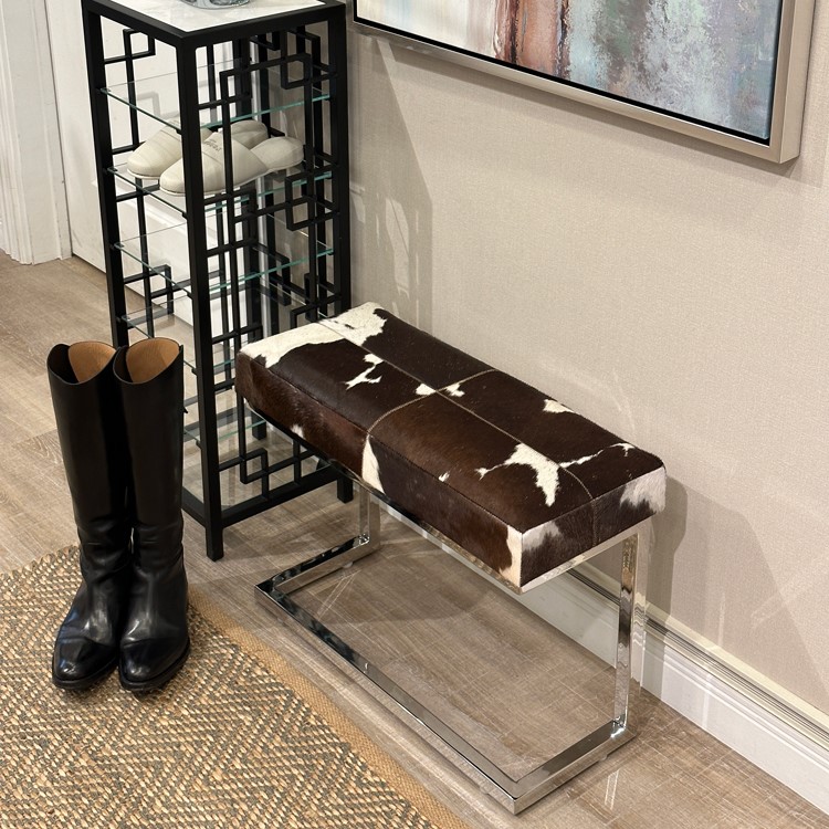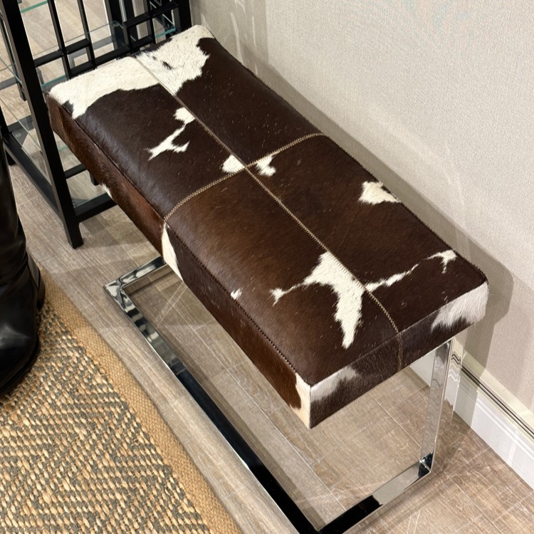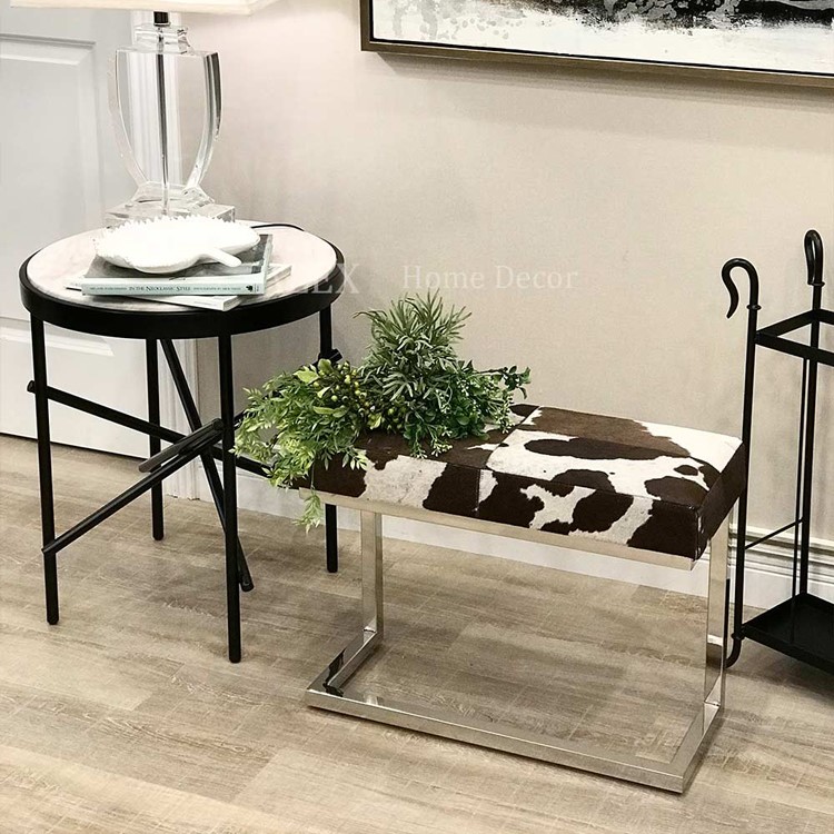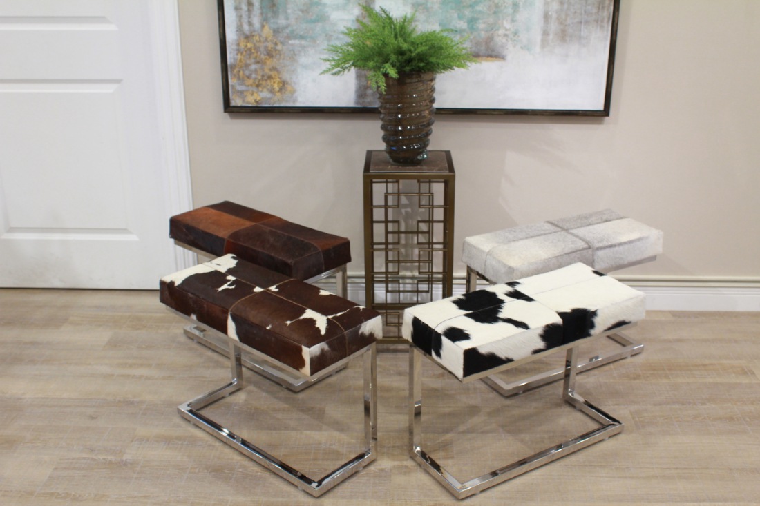 滑らかなリアルファー(牛革)と、シャープなシルバーメッキのスチール脚が、空間に上質でスタイリッシュな印象を与えます。