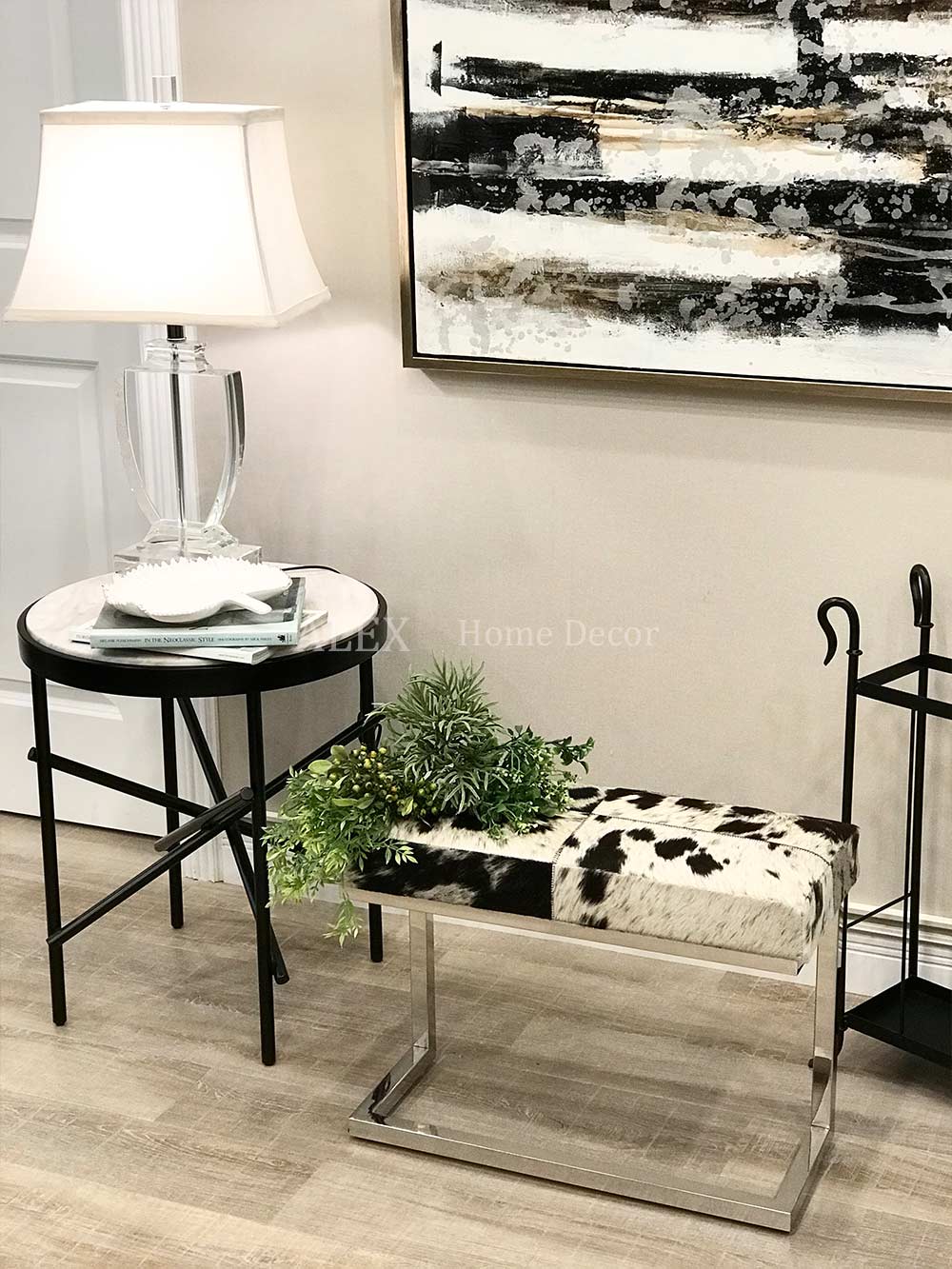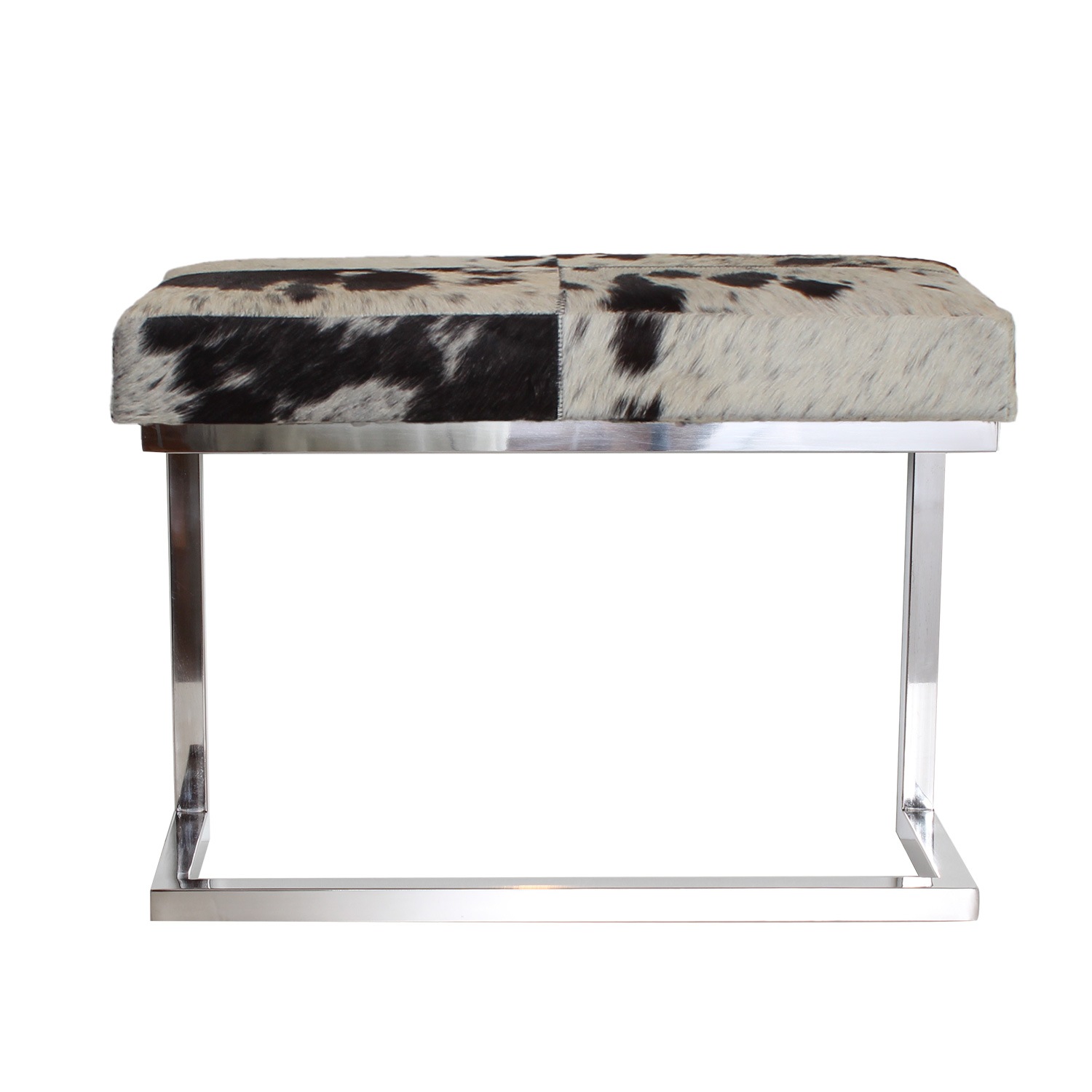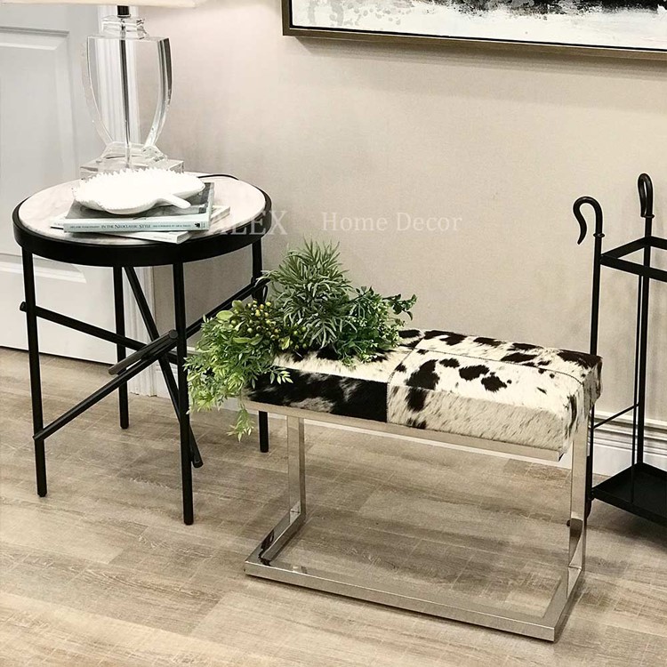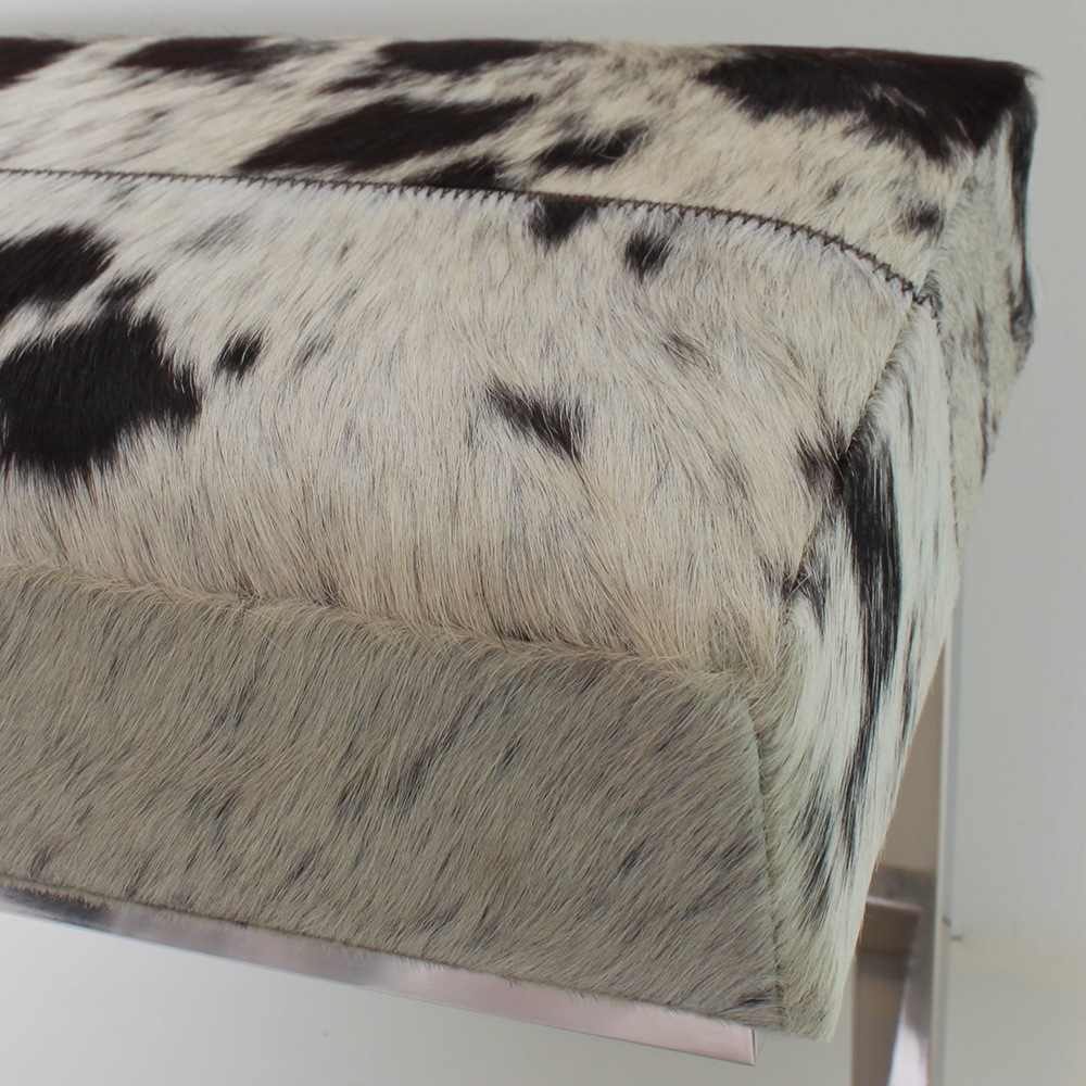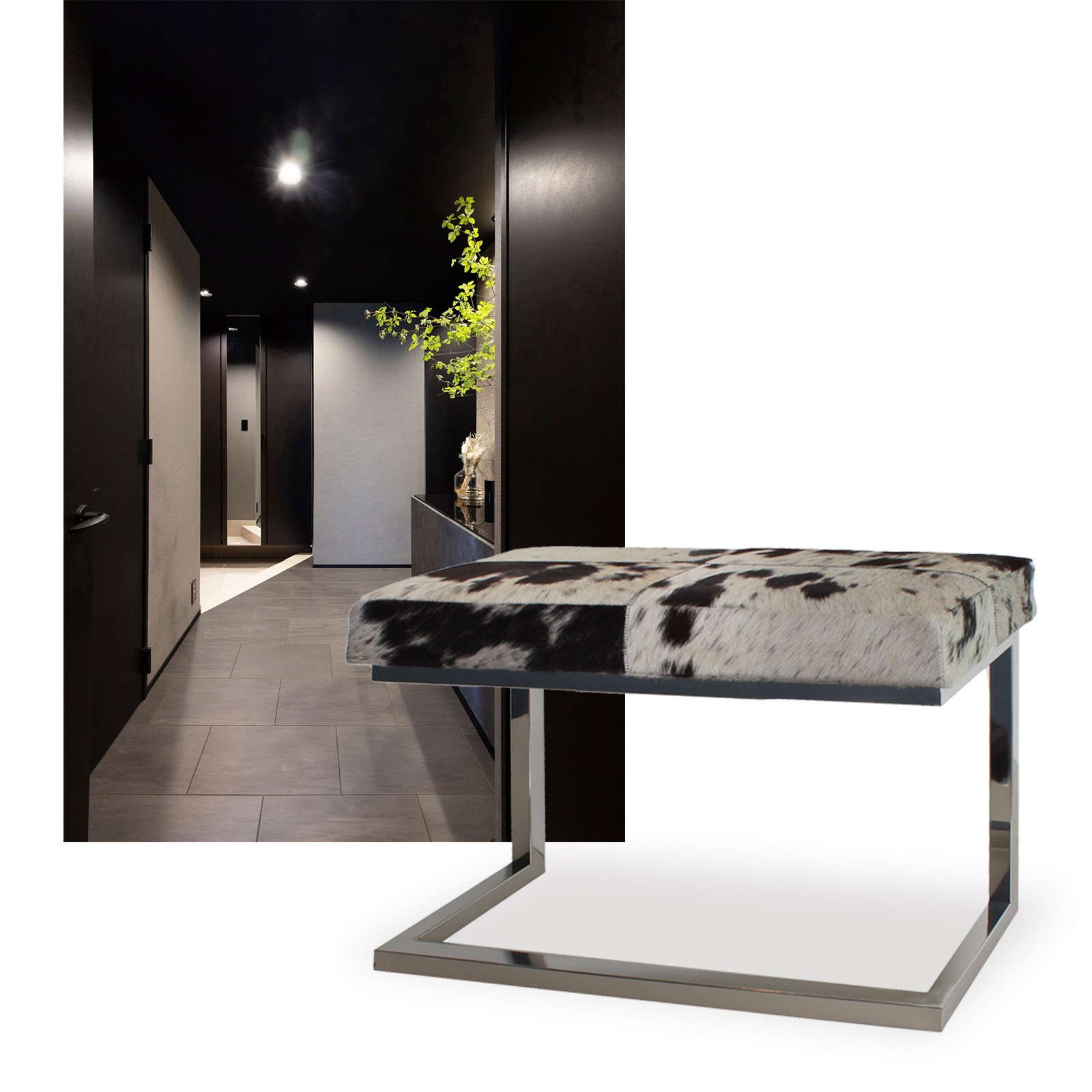 滑らかなリアルファー(牛革)と、シャープなシルバーメッキのスチール脚が、空間に上質でスタイリッシュな印象を与えます。