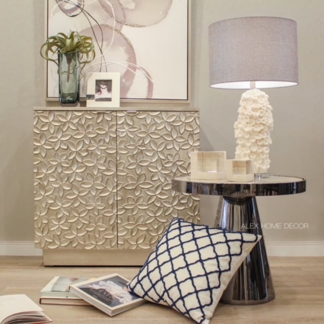 アンティーク加工された上品なシルバーなので、モダン、北欧、ナチュラルなどどんなインテリアにも合わせやすいキャビネットです。