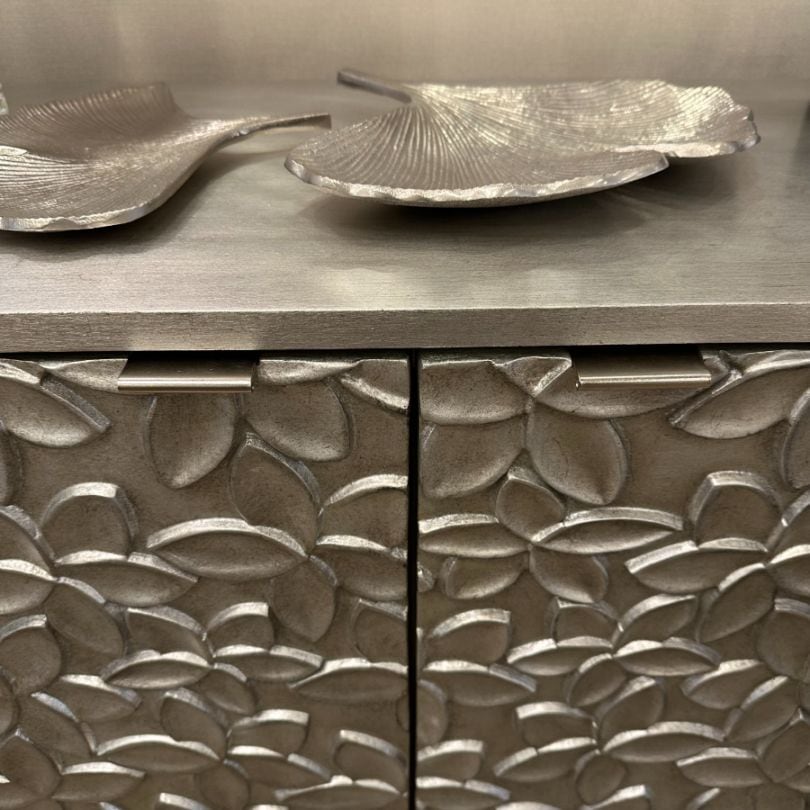 花や葉っぱのようなデザインが印象的な2ドアのキャビネット。