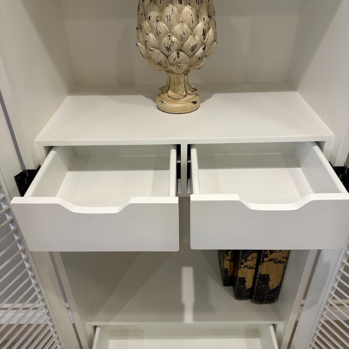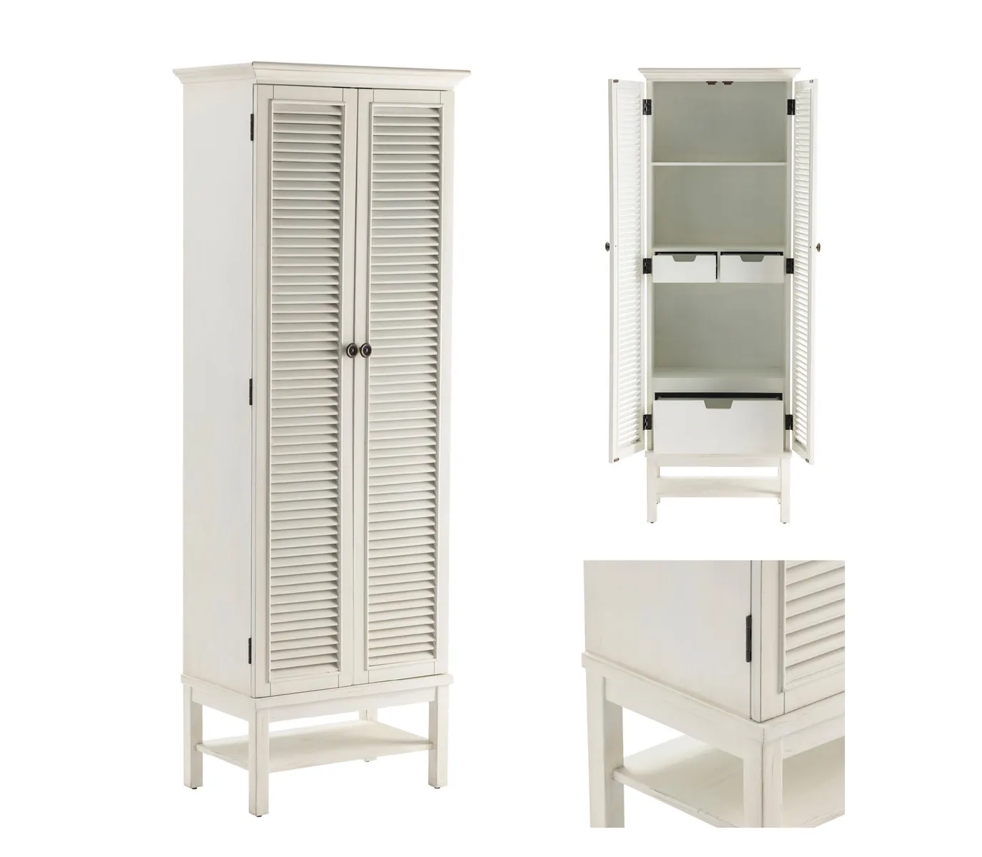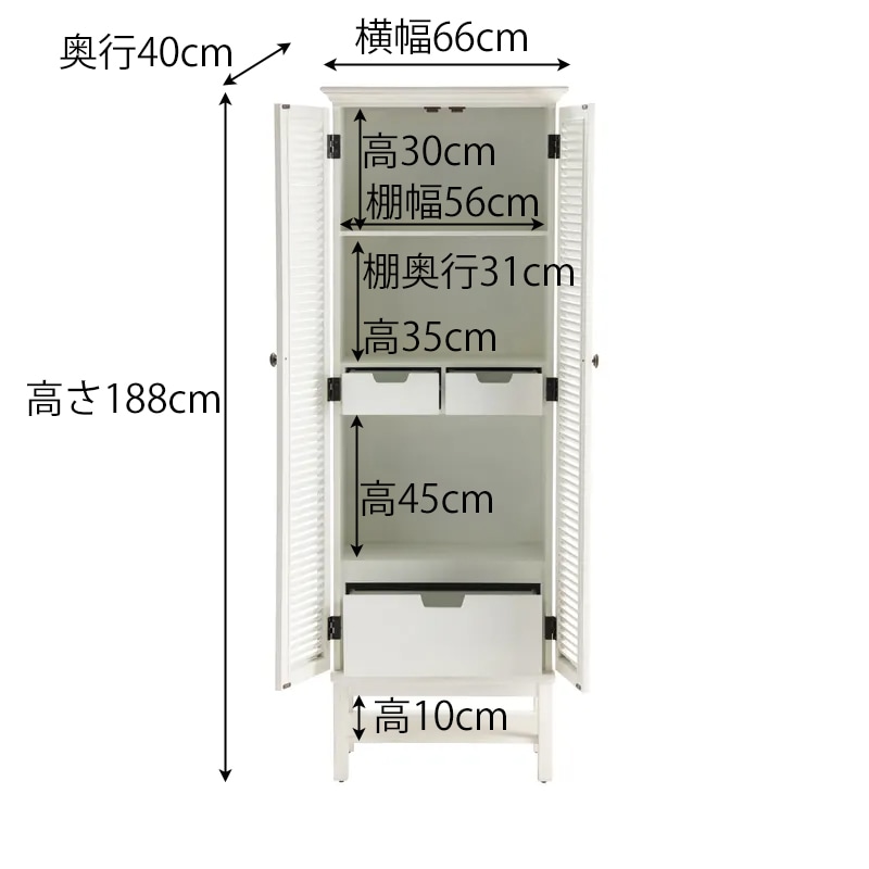 内部には可動棚と引き出しを備え、リネン類や日用品、雑貨などを機能的に収納可能。