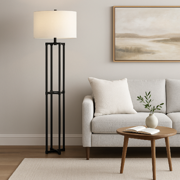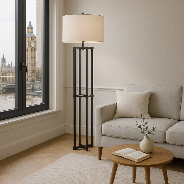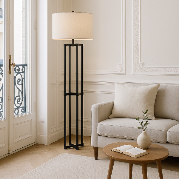 直線的で端正なシルエットが印象的な、モダンデザインのフロアランプ。