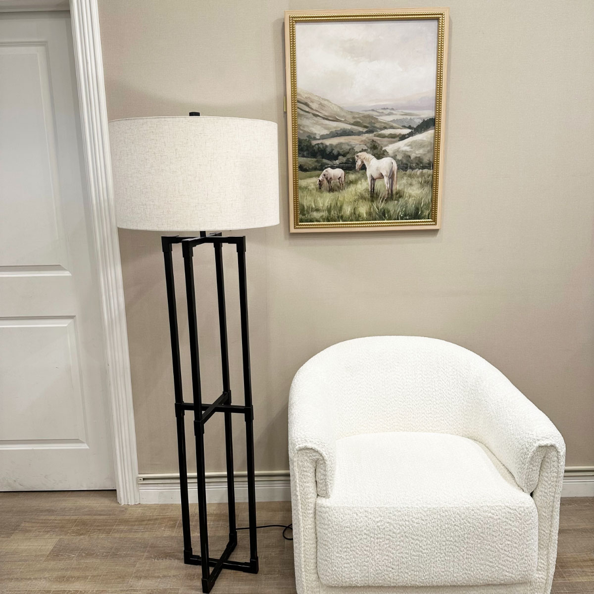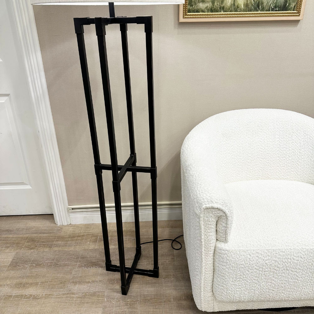 直線的でシャープなデザインが際立つ、メタルフレームのフロアランプ。
