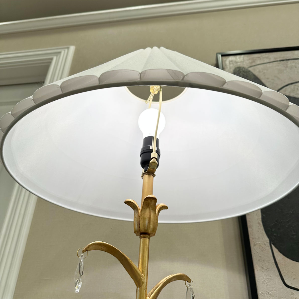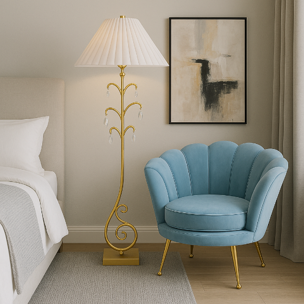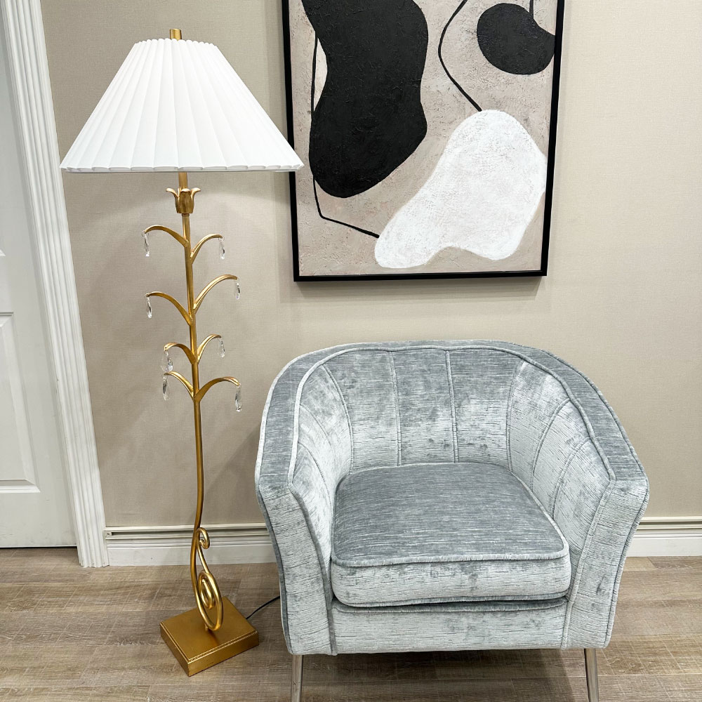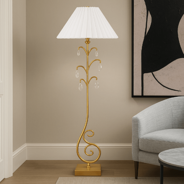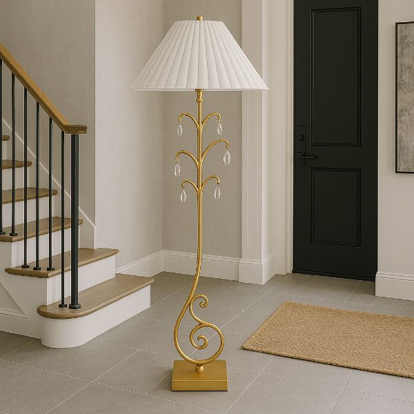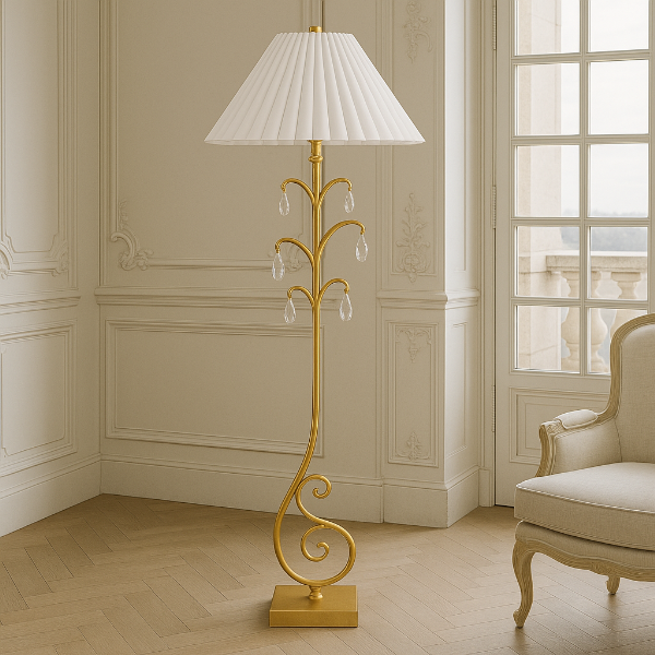 繊細な装飾と優雅な曲線が印象的なフロアランプ。